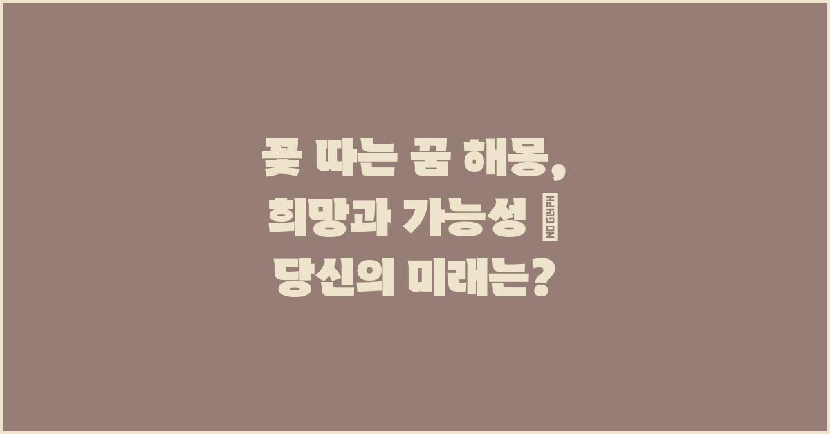 꽃 따는 꿈 해몽: 희망과 가능성은 많은 이들에게 긍정적인 메시지를 전달합니다. 꿈 속에서 꽃을 따는 것은 아름다움과 사랑, 새로운 시작을 상징하기 때문인데요. 여러분이 꿈에서 꽃을 따는 모습을 그려보면, 그것은 곧 희망의 상징이기도 합니다. 이렇게 해석되는 꿈은 우리에게 많은 가능성을 의미합니다. 덕분에 우리는 일상 속에서 새로운 목표와 희망을 찾을 수 있습니다.