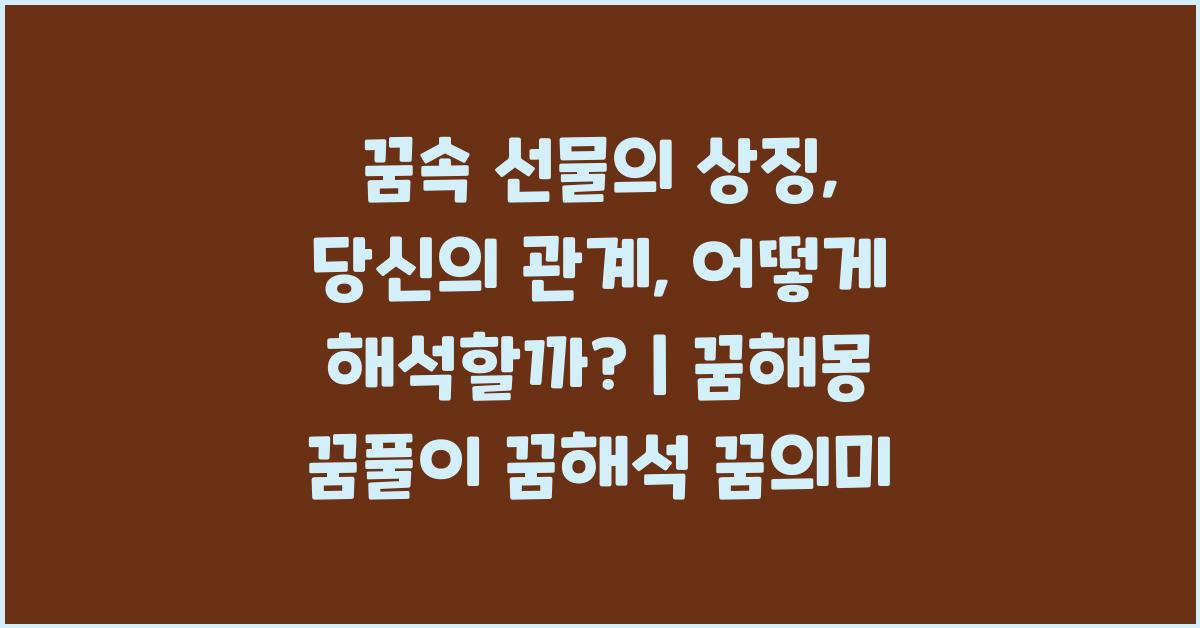 꿈속에서 선물을 받는 상황은 어떤 특별한 관계를 암시할 수 있습니다. 예를 들어, 가족이나 친구로부터 선물을 받는 꿈은 그들과의 관계가 더욱 깊어질 가능성을 나타낼 수 있습니다. 이는 꿈속 선물의 상징: 당신의 관계를 보여주는 거울이 될 수 있습니다. 즉, 선물은 감사의 표시이자 사랑의 증거로 해석될 수 있습니다.
