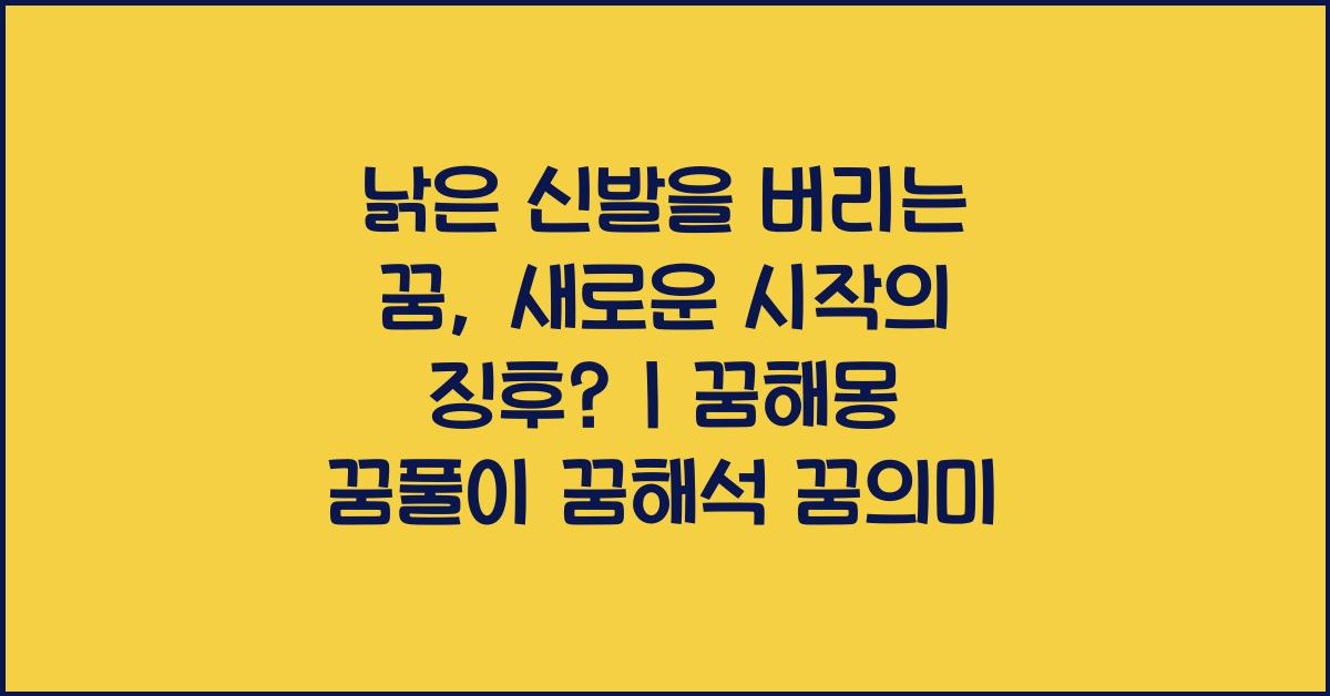 낡은 신발을 버리는 꿈, 진정한 의미는? 이러한 꿈은 단순히 물리적인 신발을 넘어서, 우리의 갈림길을 보여주는 상징적인 행위입니다. 과거를 떠나 새로운 시작을 다짐하는 꿈은 현재의 삶에서 긍정적인 변화를 가져오는 계기가 될 수 있습니다. 여러분의 꿈 속에 담긴 메시지를 잘 읽어내고 새로운 삶의 가능성을 발견할 기회를 가져보세요.
