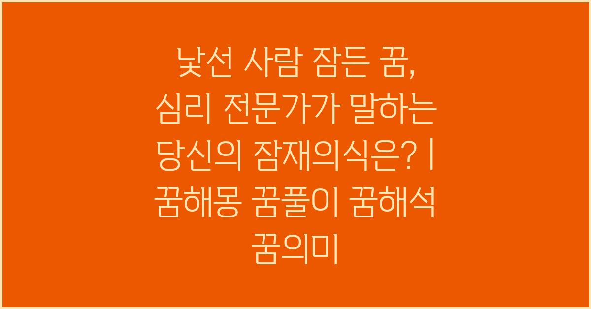 낯선 사람이 잠든 꿈, 당신의 잠재의식은? | 꿈해몽 꿈풀이 꿈해석 꿈의미를 이해하기 위해서는 우선 꿈에서 느낀 감정을 살펴보는 것이 중요합니다. 만약 그 사람이 친근하게 느껴졌다면, 이는 우리가 다른 사람들과 연결되고 싶다는 욕구의 표현일 수 있습니다. 반면에 두려움이나 불안감을 느꼈다면, 이는 미지의 상황에 대한 두려움을 반영하는 것일 수 있습니다.