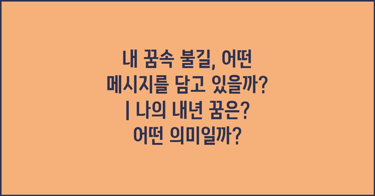 내년의 꿈은 여러분의 목표와 비전을 포함하는 그것일 수 있습니다. 꿈은 구체적인 목표를 설정하는 데 드는 큰 힘과 에너지를 주기도 하며, 특히 꿈속 불길과 연결될 때 더욱더 깊은 의미를 가집니다. 목표를 구체화하면서 염원을 성취하려는 의지를 다지는 것은 굉장히 중요합니다. 예를 들어, 내년에는 어떤 새로운 도전을 계획하고 있는지 생각해보세요. 그 계획이 내 꿈속 불길과 연결되어 어떤 의미를 갖고 있는지를 고민해보는 것이죠.