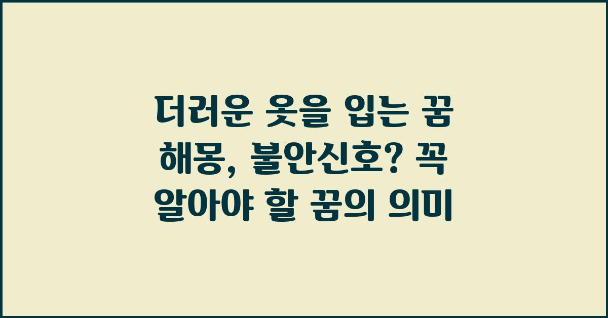 더러운 옷을 입는 꿈 해몽: 불안신호?라는 질문이 떠오르지 않는다면 그건 아마도 여러분의 무의식이 발동하고 있는 순간일 것입니다. 꿈에서 더러운 옷은 나의 감정 상태, 또는 주변의 상황에 대한 불안감을 반영할 수 있습니다. 이 꿈이 우리에게 어떤 메시지를 전하고 있는지에 대해 깊이 파고들어보겠습니다.