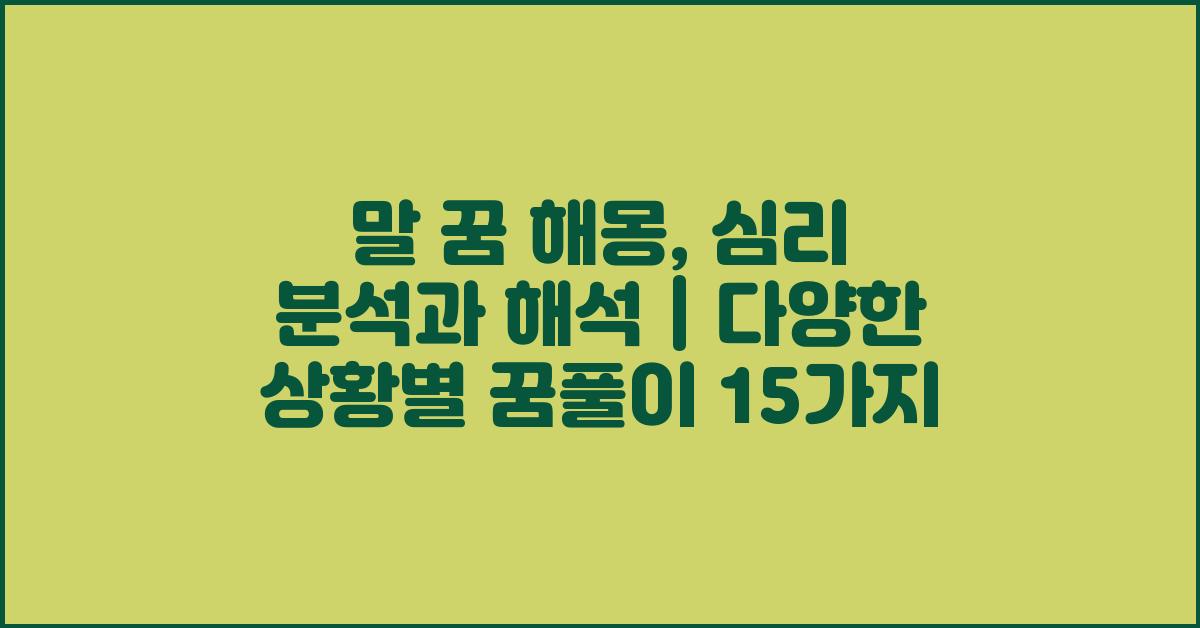 그럼 이제 말 꿈 해몽의 여러 가지 상황에 대해 심층적으로 살펴보겠습니다. 꿈에서의 말의 행동이나 상태에 따라 여러 해석이 가능하기 때문이죠. 예를 들어, 말이 부상을 입거나 늦게 달리는 상황은 현재의 과제가 막혀 있거나 갈등을 내포하고 있을 수 있습니다. 이러한 해석은 '말 꿈 해몽: 심리 분석과 해석 | 꿈해몽 꿈풀이 꿈해석 꿈의미'와 집합적으로 연관될 수 있습니다.