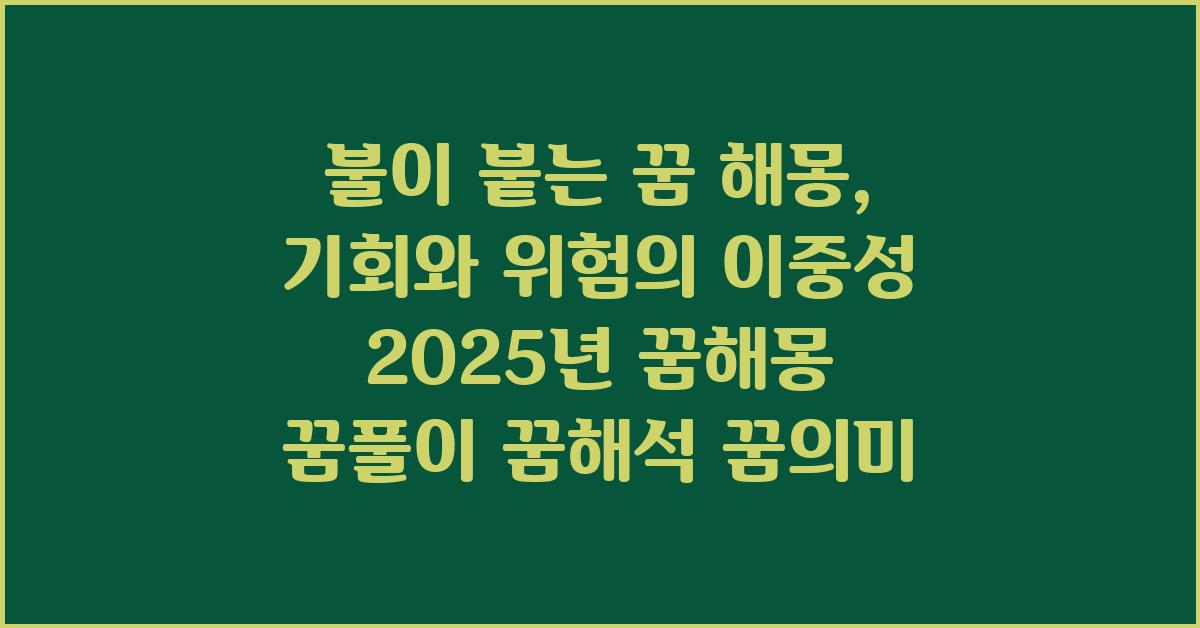 꿈은 우리가 잠자는 사이에 경험하는 신비한 세계입니다. 그중에서도 불이 붙는 꿈은 특히 많이 이야기됩니다. 불의 이미지는 강렬하며, 그 자체로 많은 상징을 내포하고 있습니다. 예를 들어, 불은 열정, 변화, 그리고 심지어 파괴를 의미할 수 있습니다. 그렇다면 불이 붙는 꿈 해몽: 위험과 기회의 신호 | 꿈해몽 꿈풀이 꿈해석 꿈의미는 어떤 의미를 내포하고 있을까요? 이러한 꿈을 통해 우리는 어떤 경고 메시지를 받을 수 있을까요?
